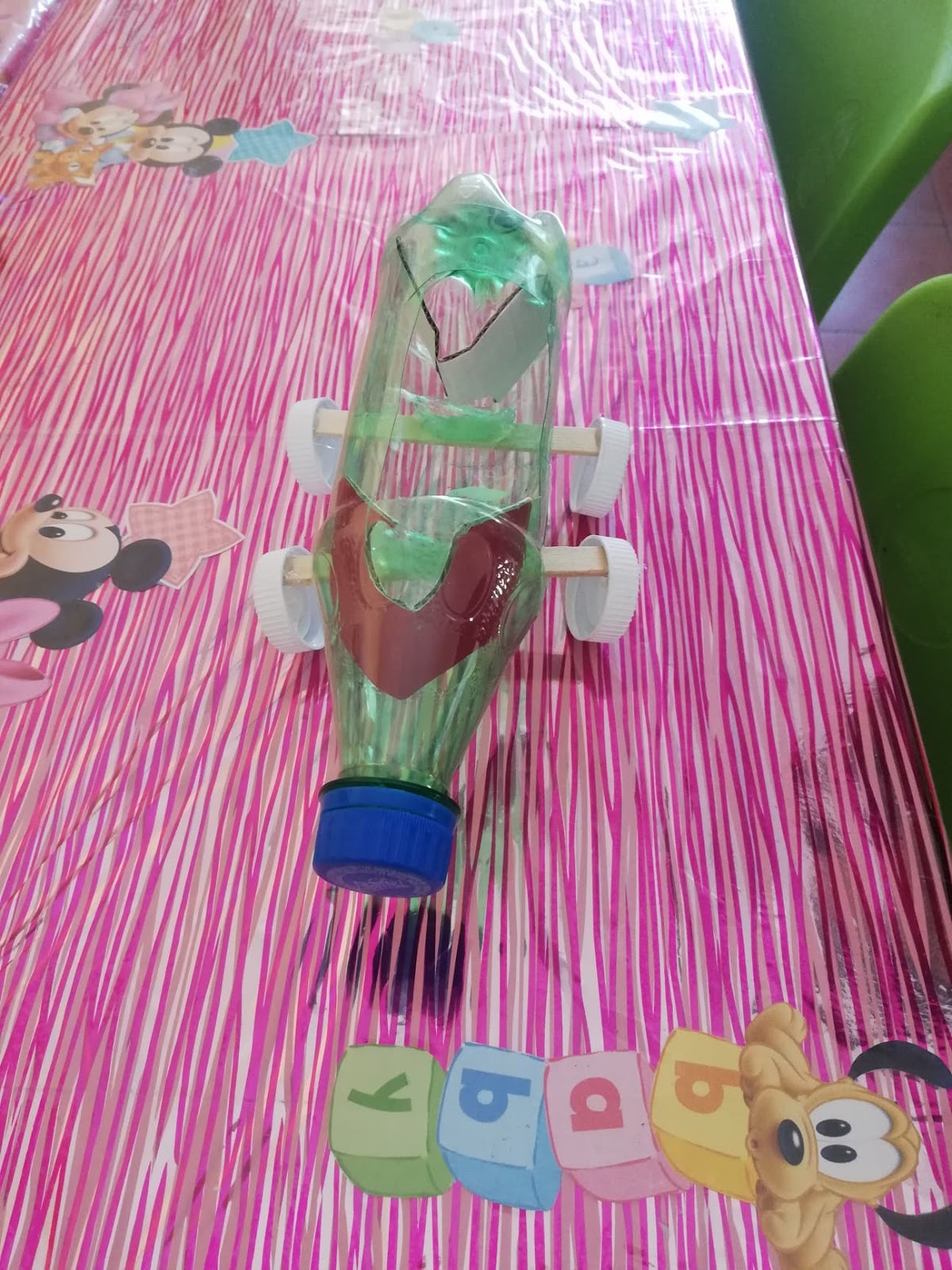 Para empezar cortaremos la botella de manera que acostada quede un espacio, continuaremos pegando las tapas en los extremos de cada palo de madera, luego vamos a pegar los palo de madera en la parte de abajo de la botella para que esas sean sus rueda, con el cartón vamos a cortar un pedazo que quepa dentro de la botella para que sean los asientos. Y nuestro carro esta listo.